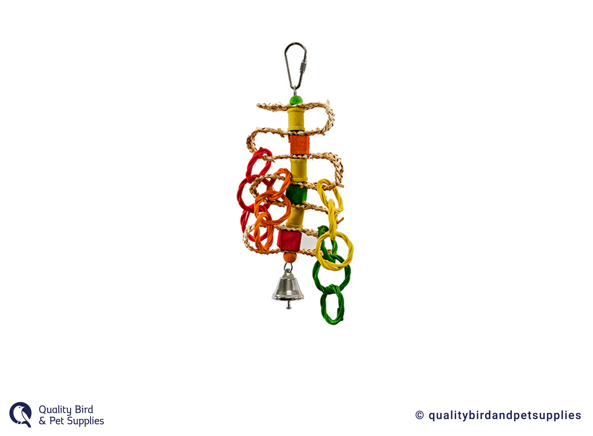 Featherland Paradise designed the Small Braided Spools and Blocks for small parrots. Because your parrot likes variety, there are lots of natural materials to touch and chew. We strung colourful spools and blocks on a stainless steel wire and snaked braided grass between them. Then we hung coloured vine chains from the grass mats and put a bell on the bottom for audible enrichment. Your bird will love choosing what to do first!