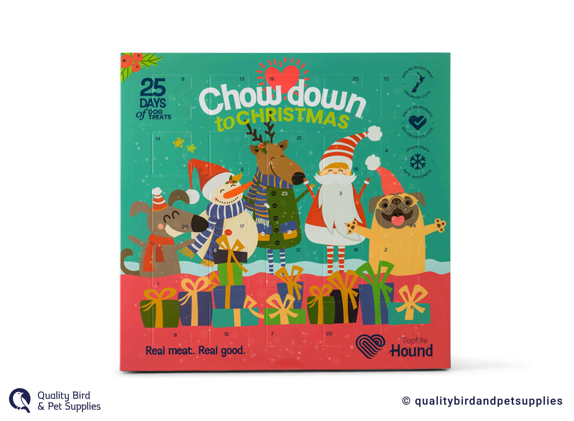 Behind each of the 25 windows a prime cut of real freeze-dried meat awaits ol’ Slobber Chops. Keep your dog’s nose guessing with six of Hound’s choicest meat cuts: Steak Bites, Tripe Slice, Chicken Chips, Liver Lot, Salmon Skins or Salmon Crumble.