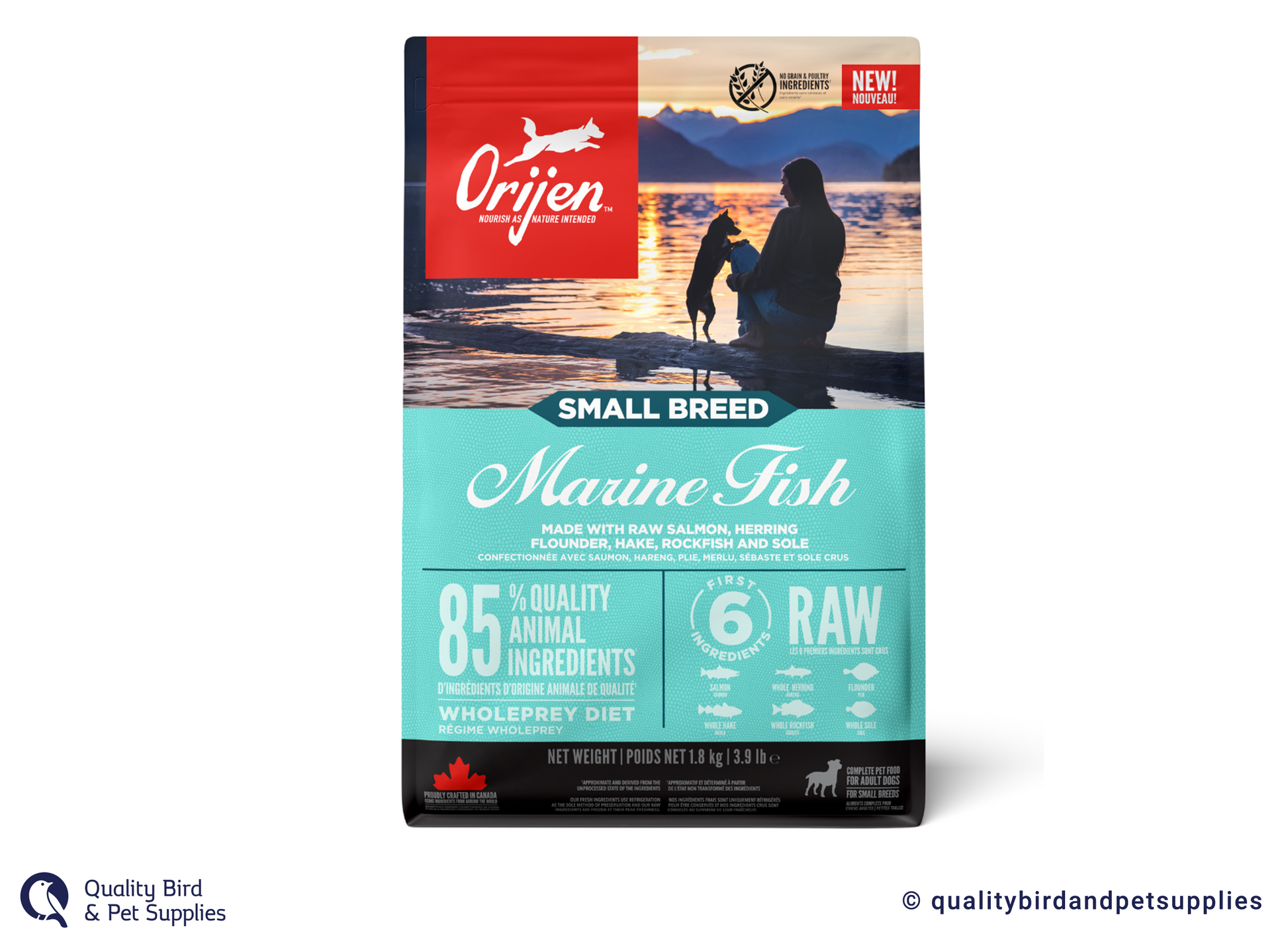 Your small dog is big on personality—and needs a diet to match. ORIJEN™ Small Breed Marine Fish is specially crafted for smaller dogs, with a unique kibble shape that's easier to chew and packed with protein from wild-caught fish. This nutrient-dense recipe is an excellent alternative for dogs with poultry allergies or intolerances. It supports healthy digestion and is rich in omega fatty acids to promote a shiny coat and healthy skin. With balanced nutrition to help maintain a healthy weight and energy levels, plus New Zealand green mussels and herring oil to support joint health, it’s everything your small companion needs to thrive from the inside out—with a delicious fish flavour they’ll love.