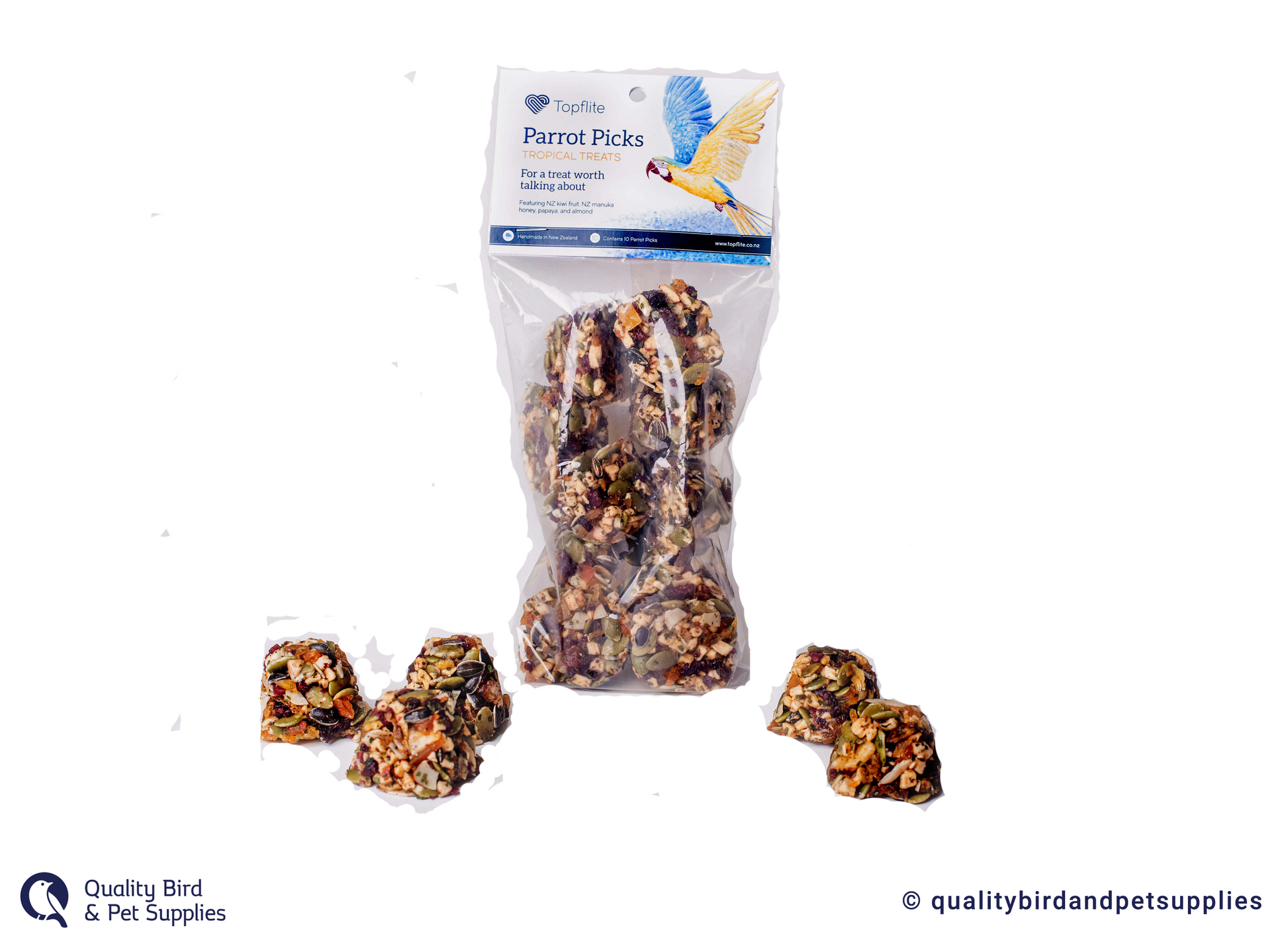 These yummy treats come in two flavours: Tropical Treats & Vital Veggies Each bag contains 10 Parrot Pick treats